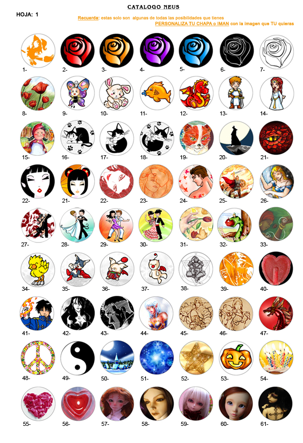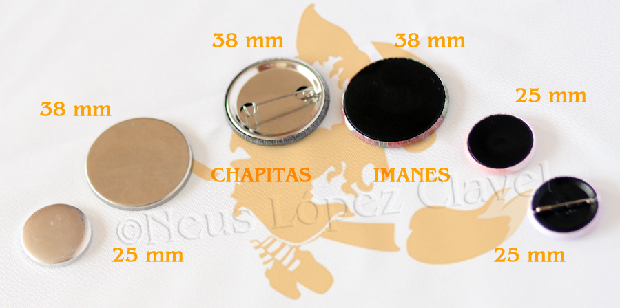 Las chapitas e imanes las teneis en dos tamaños 25 mm (pequeñas) y 38 mm (grandes) y, son totalmente personalizables. Podeis poner la imagen, foto o dibujo que mas os guste, acompañarla con un nombre o sin nada (como he puesto de ejemplo). Tambien se puede poner un fondo de un color y una frase divertida, el logotipo de tu empresa, el nombre de tu peña, falla o asociación.
